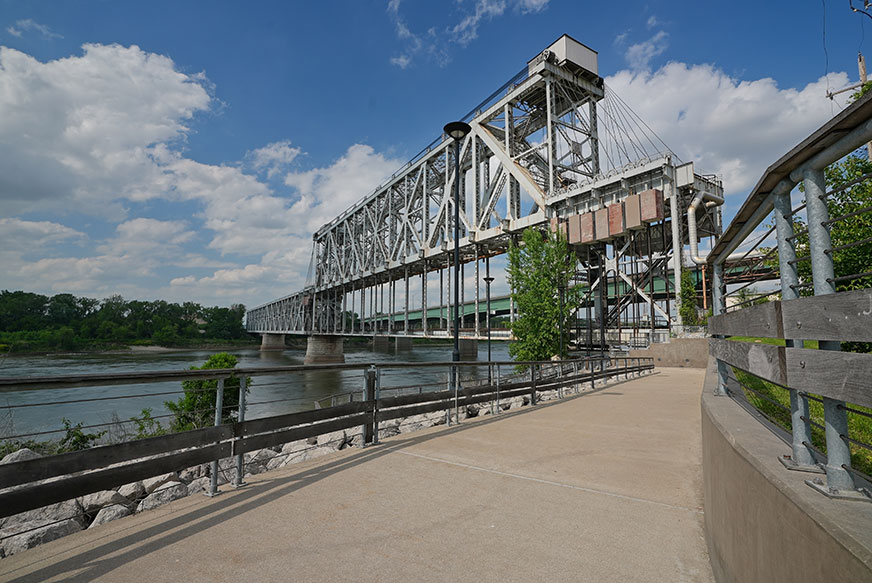 The ASB Bridge created a barrier to the bi-state Riverfront Heritage Trail system with segments of the trail on both sides of the bridge. BNIM and Taliaferro & Browne developed plans to skirt the bridge by building a flood-proof concrete bicycle/pedestrian trail under the bridge on the “wet-side” of the Missouri River levee.